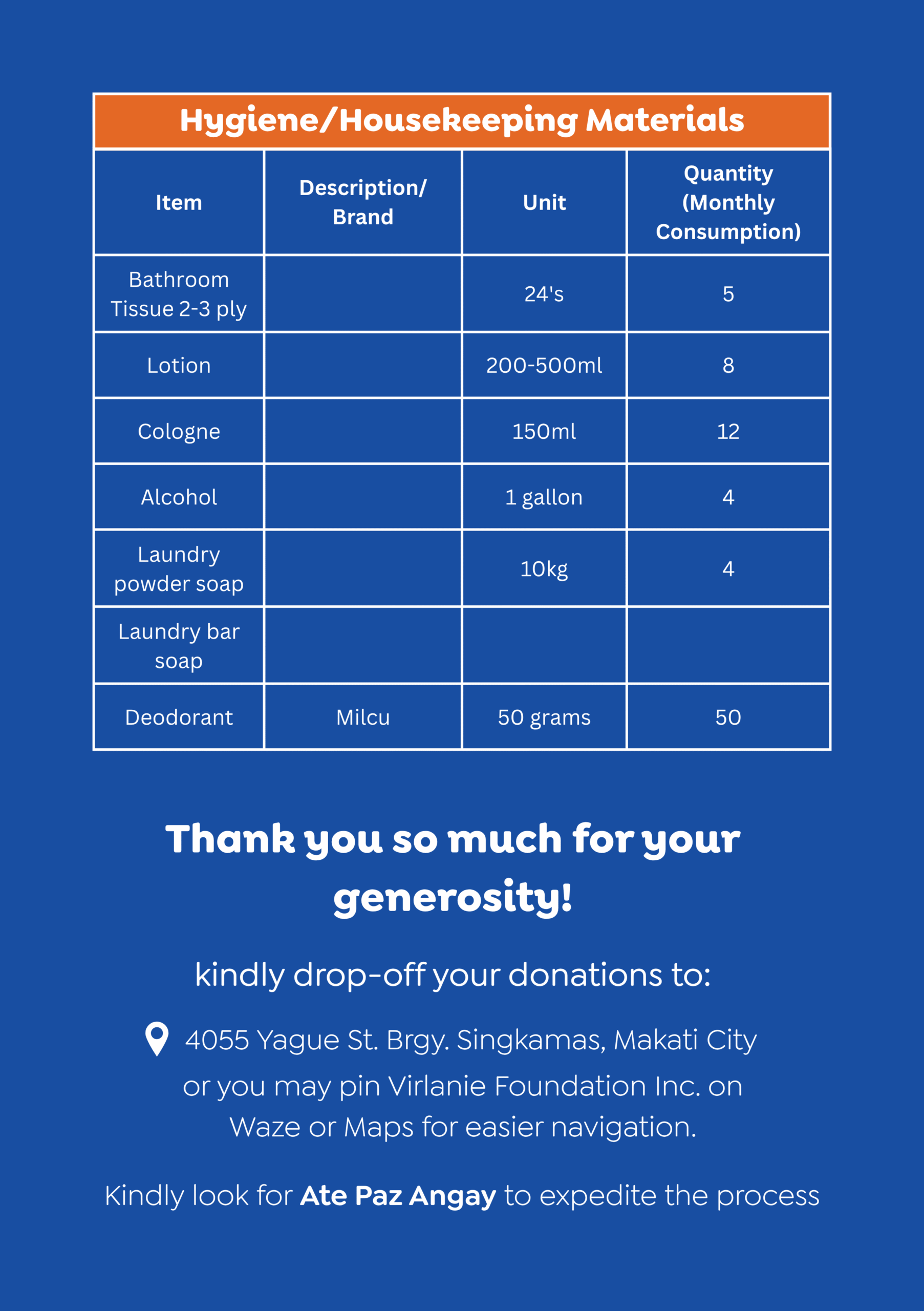 By donating monthly, your beneficiary is ensured that their needs will be met consistently.